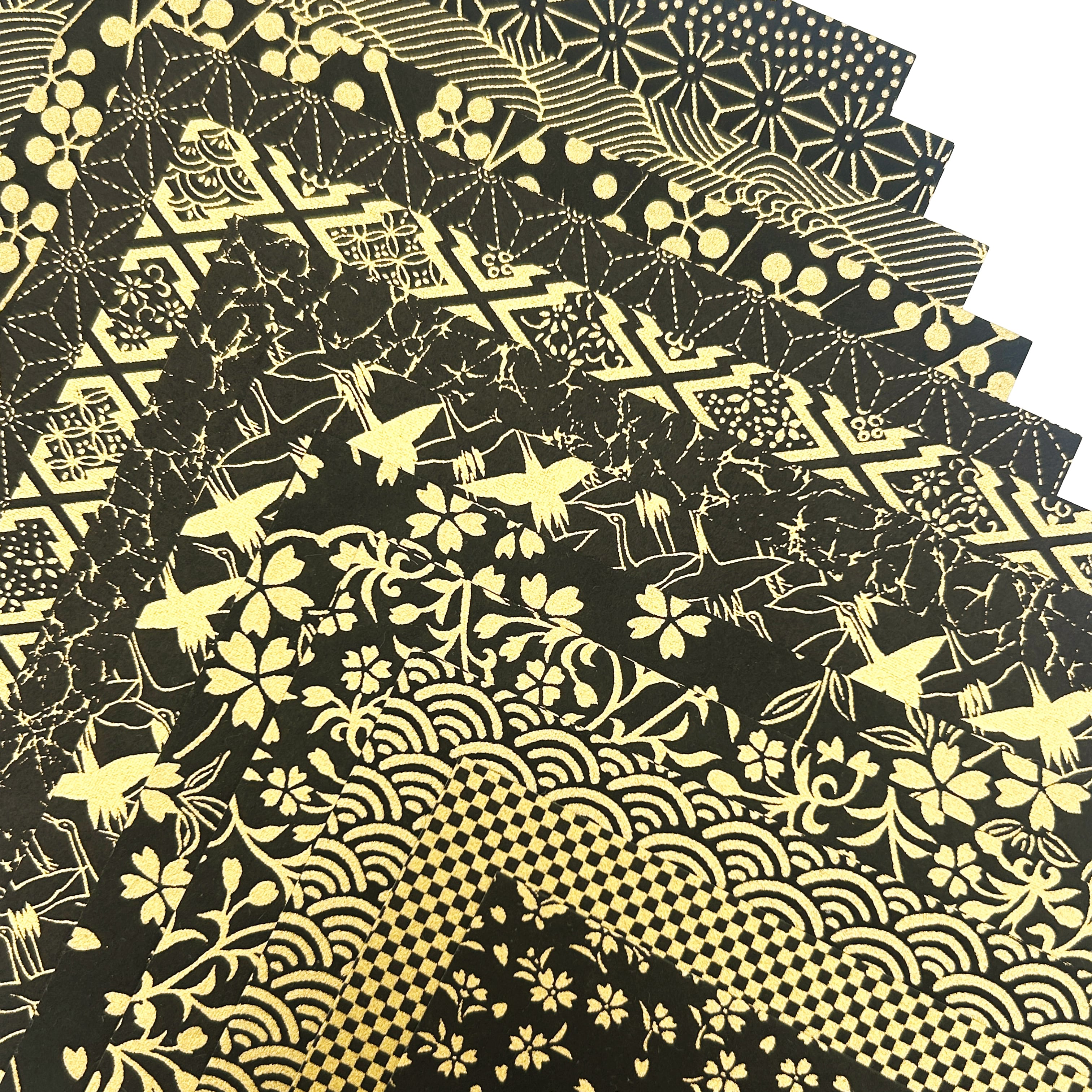 . ※掲載商品は店頭販売もしておりますので、売り切れの場合は御容赦下さい。 . サイズ:15cm角 枚数:26枚(13種各2枚) 染色方法:手捺染 産地:京都府 . 伝統の技法と洗練されたデザインが融合した上品な和紙。 落ち着いた黒をベースに金色が美しく映える、存在感のある仕上がり。 麻の葉、青海波、市松、桜など、日本の伝統文様を中心に、 繊細で華やかな柄を取り揃えました。 折り紙、和紙人形、くるみ絵、貼り箱、 工作、ハンドメイド、コラージュ素材などの用途でお使いいただけます。 紙ものが好きな方や紙ものを集めている方にもおすすめの商品です。 ■ 友禅紙について 友禅紙とは、着物の染色技法である「友禅染」に見られる意匠を施した和紙のこと。 その名は、江戸時代に京都で活躍した扇絵師・宮崎友禅斎に由来するといわれており、 染めによる繊細な柄表現や、奥行きのある色彩が特長です。 ■ 手捺染(てなっせん)という技法 この友禅紙は「手捺染」と呼ばれる技法で制作されています。 数種類の顔料と樹脂を混ぜ合わせて色を調合し、原紙に型を合わせ、 大きなヘラを使って一色ずつ丁寧に染め重ねています。 非常に手間のかかる技法ですがその分発色が良く、美しい仕上がりとなり、 顔料を使用しているため色の経年劣化がほとんどない点も特長のひとつです。 . 【備考】 掲載商品は店頭販売もしておりますので、売り切れの場合は御容赦下さい。 商品の色など実物を再現する画像調整をしていますが、 ご利用モニターの設定等で、画面上、実物とは異なる表示になる場合があります。 【お届け先が離島の場合】 離島へのお届けをご希望の場合はこちらをお読みください。 →https://shiyou.base.shop/items/109180543